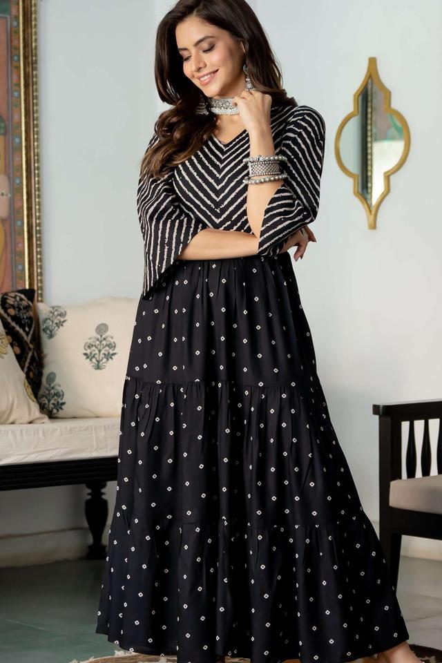 Buy RUSTORANGE Black Printed Rayon V Neck Women s Ethnic Dress Very well made.