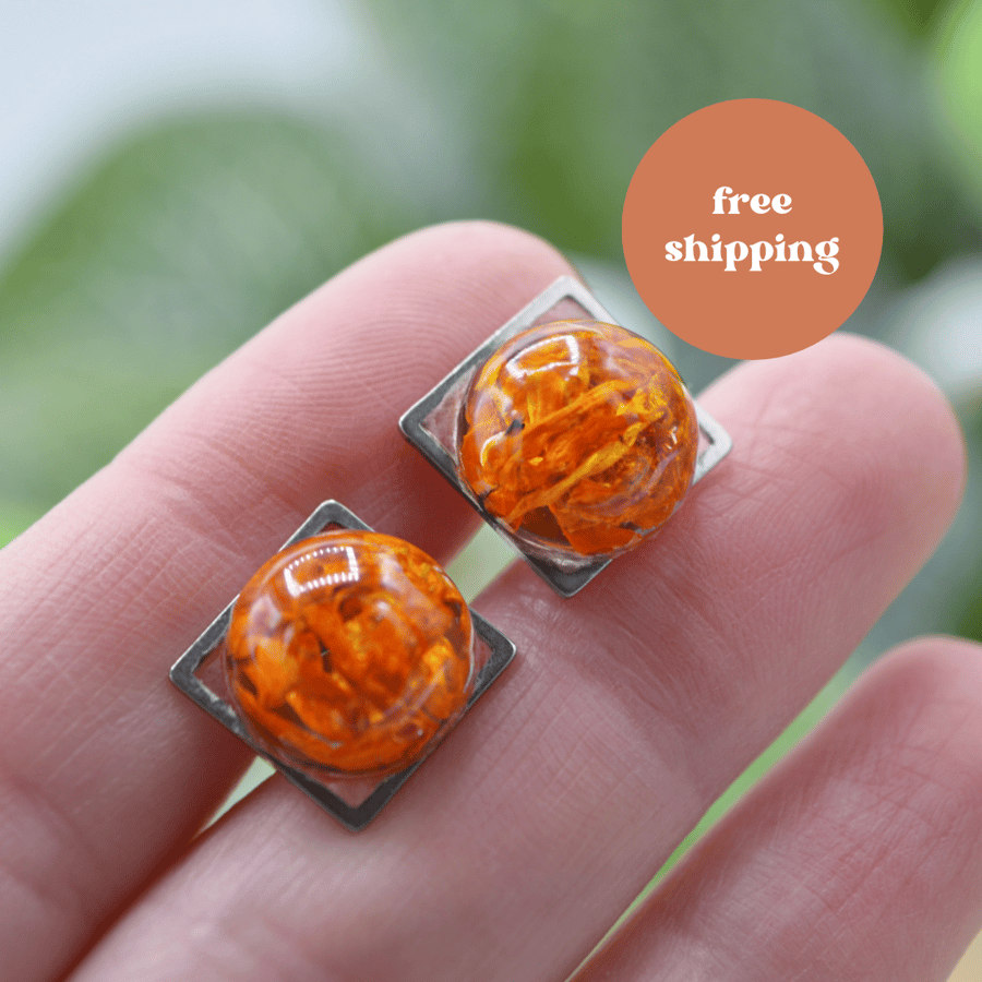 Orange Marigold Petal Square Resin Stud Earrings Free Postage Very well made.
