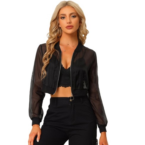 Allegra K Women s Long Sleeve Crop Sheer Mesh Bomber Jacket Black Very well made.