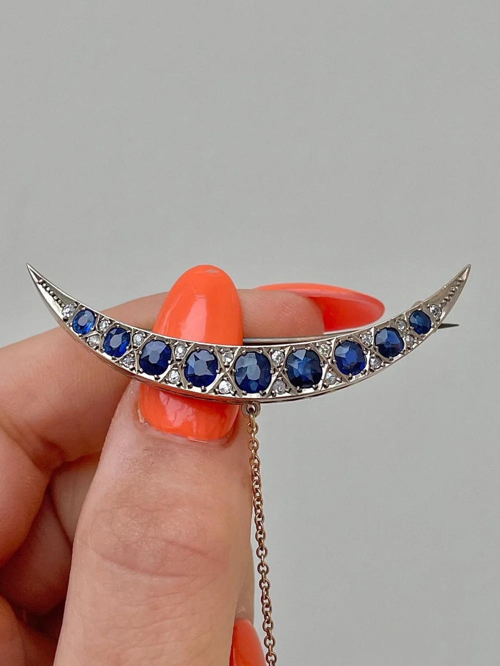Antique Chunky Sapphire and Diamond Crescent Brooch in Yellow Gold Gembank1973 Very well made.