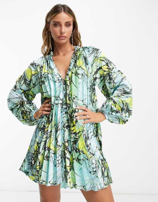 ASOS DESIGN button front satin pleated babydoll dress in black and yellow marble Very well made.