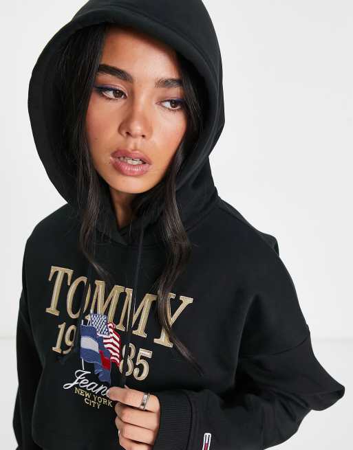 Tommy Hilfiger felpa nera donna in cotone crop fit con cappuccio Very well made.