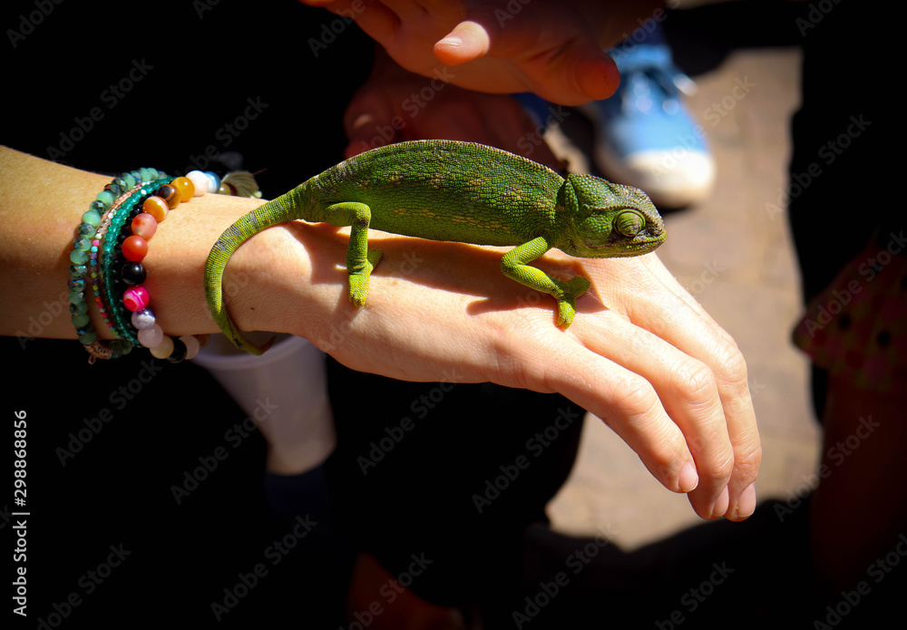 Chameleon on a female s hand used by the shopkeepers of marrakesh Very well made.