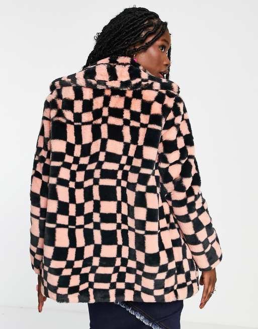 Girlfriend Material faux fur wavy checkerboard print short coat in peach and black Very well made.