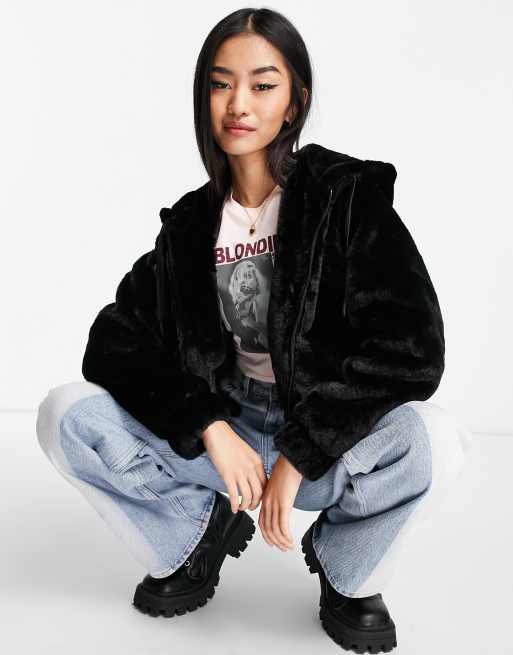 Pull Bear Giacca in pelliccia sintetica nera con cappuccio Very well made.