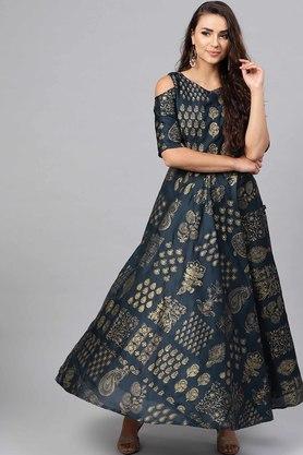 Womens Teal Shantoon Gold Foil Print Ethnic Gown With Cold Shoulder Sleeves Very well made.