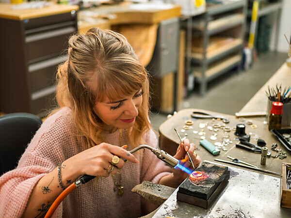 Bildagentur mauritius images Smiling craftsperson welding gold Very well made.