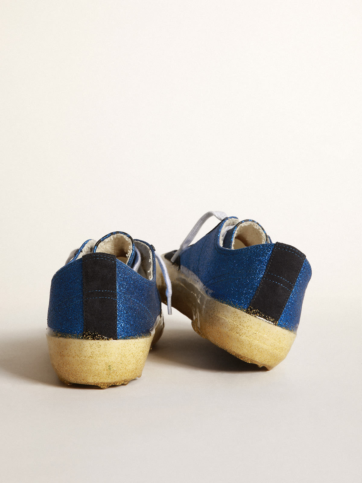 V Star sneakers in electric blue micro glitter with white patent leather star and black suede heel tab Very well made.