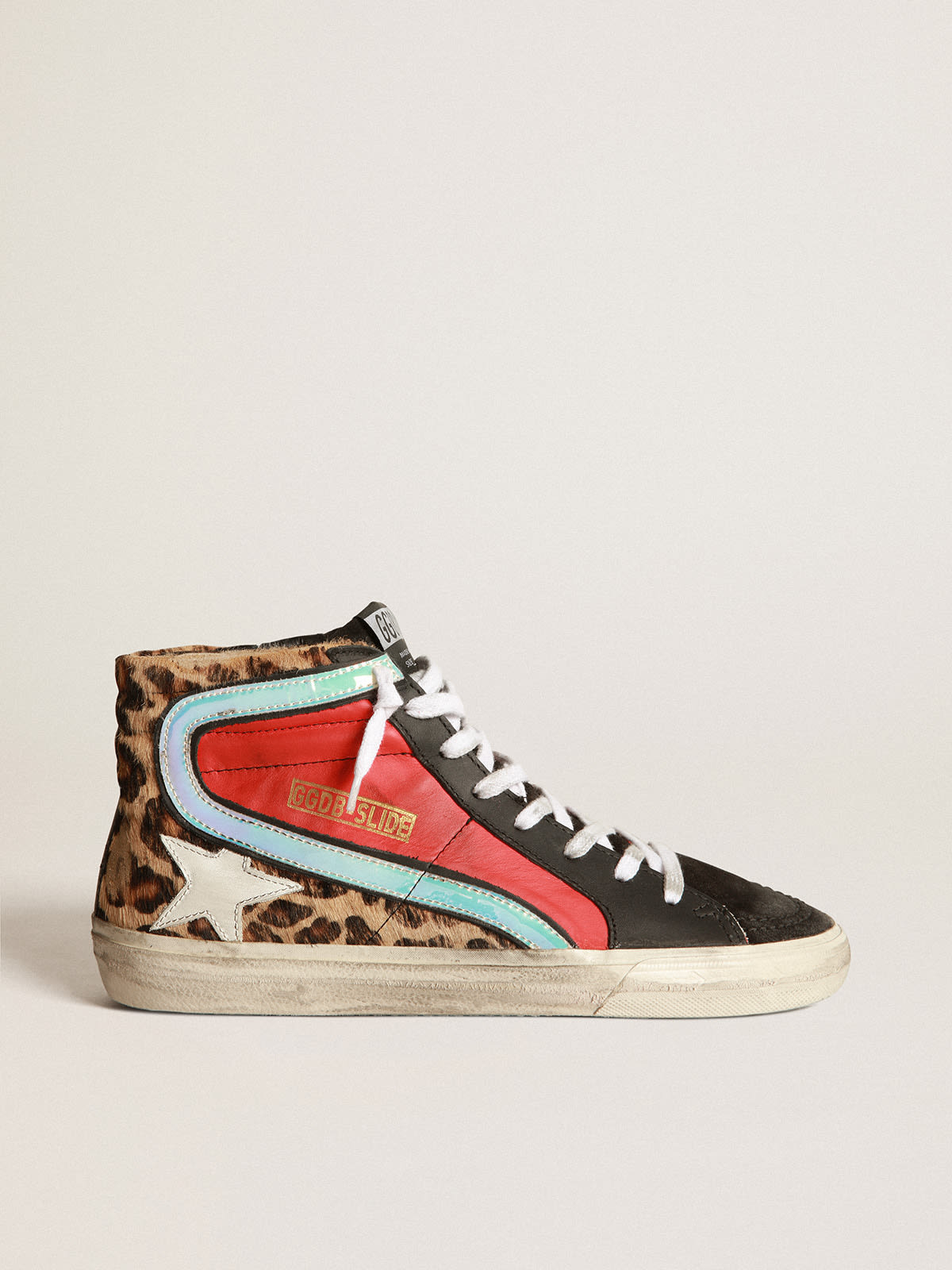 Slide sneakers in red leather and leopard print pony skin with Very well made.