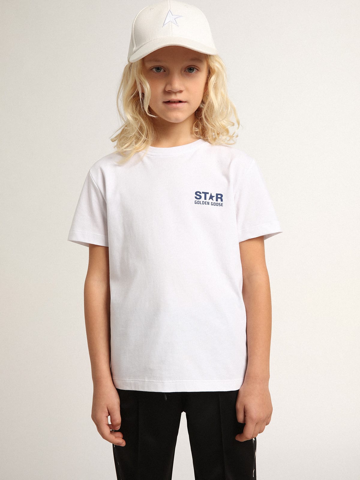 Boys white T shirt with contrasting dark blue logo and star Very well made.