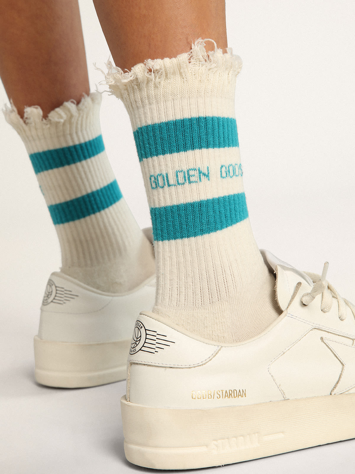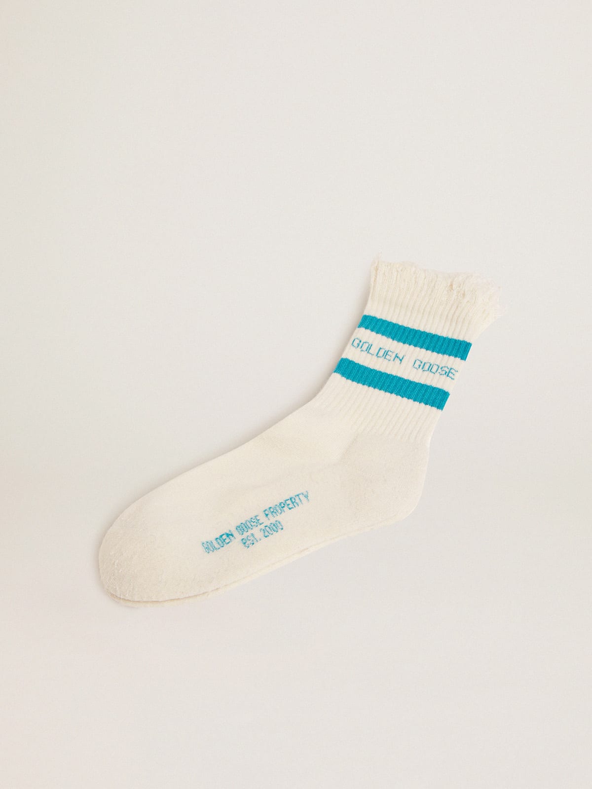 Distressed finish white socks with turquoise logo and stripes Very well made.