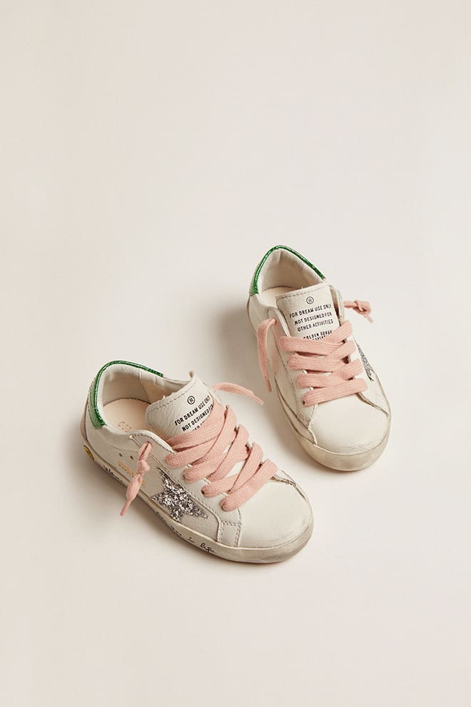 Super Star sneakers with silver glitter star and green glitter heel tab Very well made.