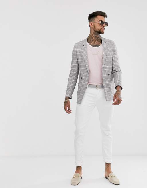 ASOS DESIGN slim double breasted grey blazer with pink prince of wales check Very well made.