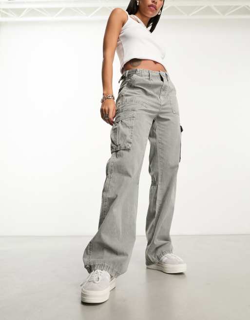 Bershka adjustable waist straight leg cargo pants in washed grey Very well made.