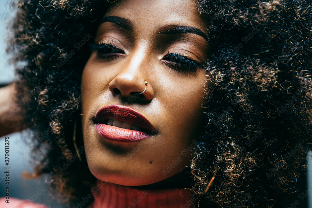 Close up portrait of woman with natural hair and nose ring Stock Very well made.