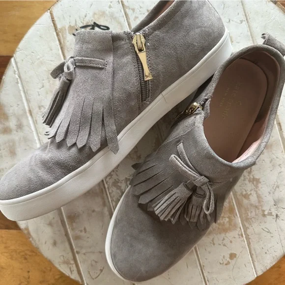 Kate Spade Taupe Suede Lena Tassel Fringe Zip Up Side Low Top Very well made.