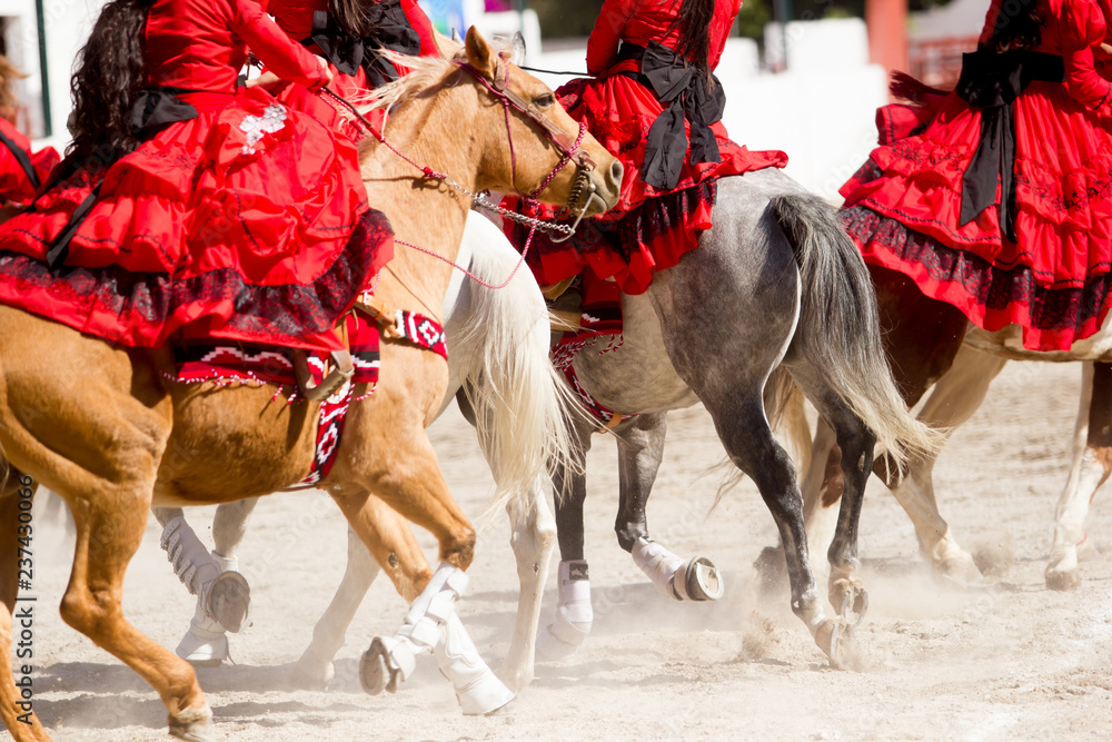 Group of mexican escaramuza girls with red mexican dresses ride Very well made.