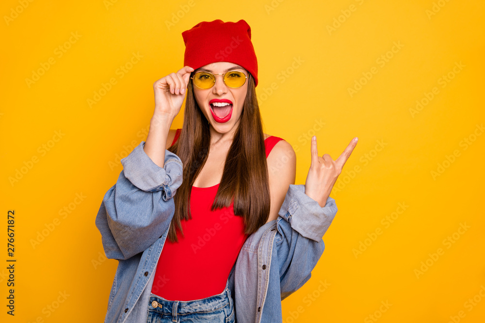 Photo of funky lady bright lips nice colorful look visit rock Very well made.