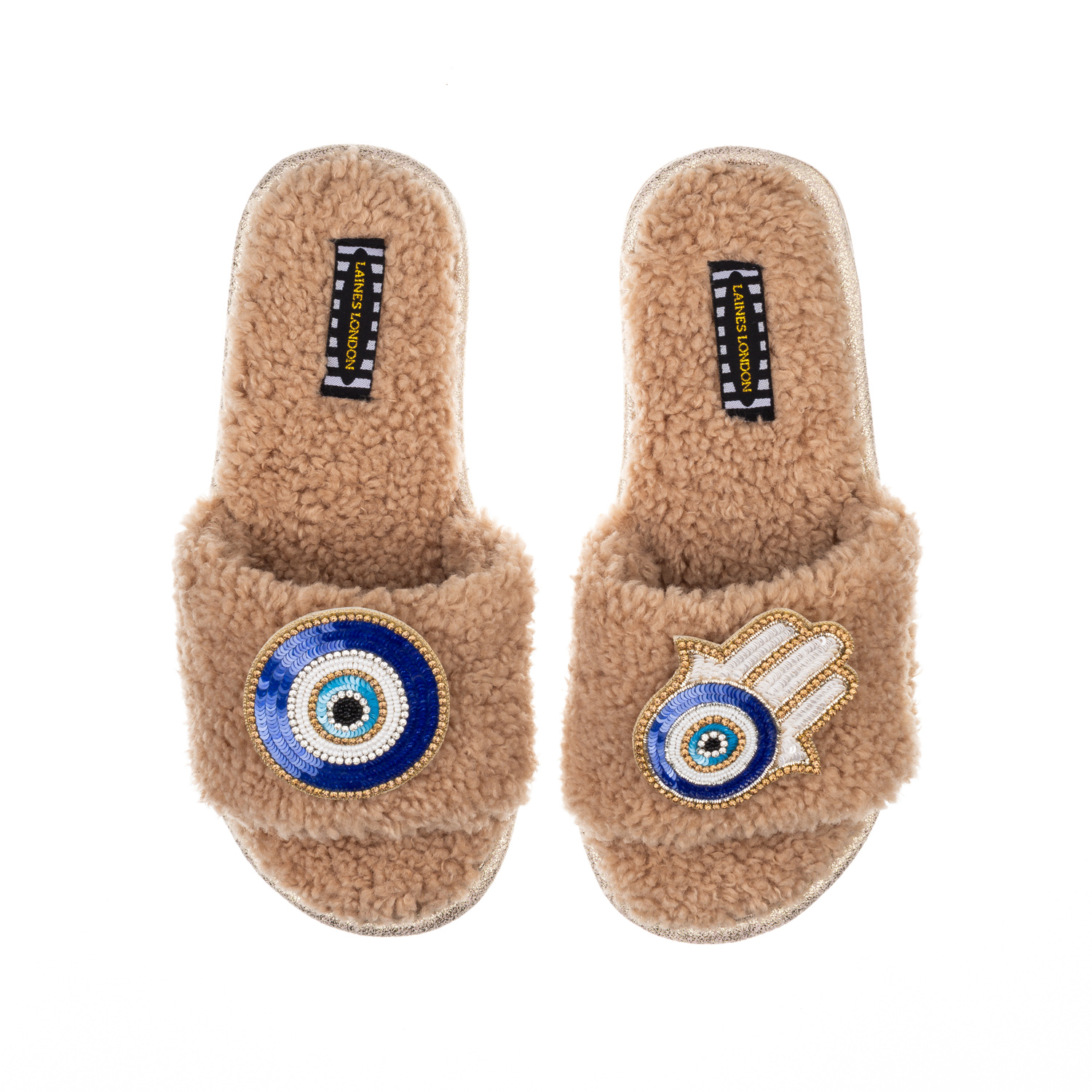 Teddy Towelling Slipper Sliders With Evil Eye Hamsa Hand Very well made.