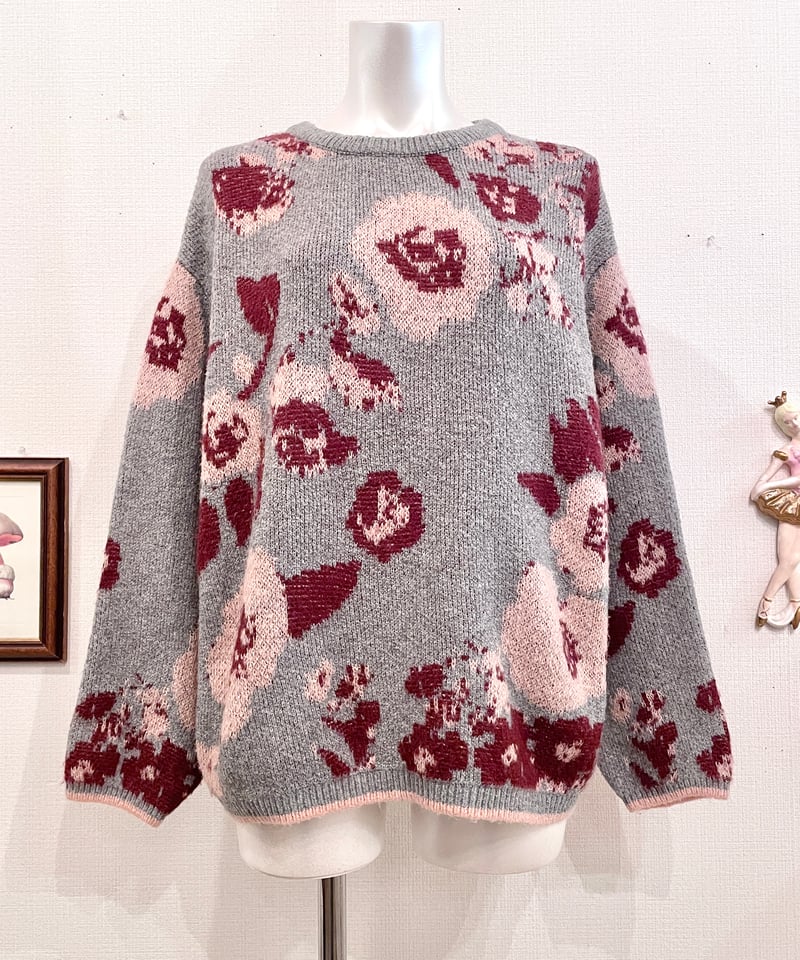 Vintage Pale Gray Floral Design Knit Sweater M Very well made.