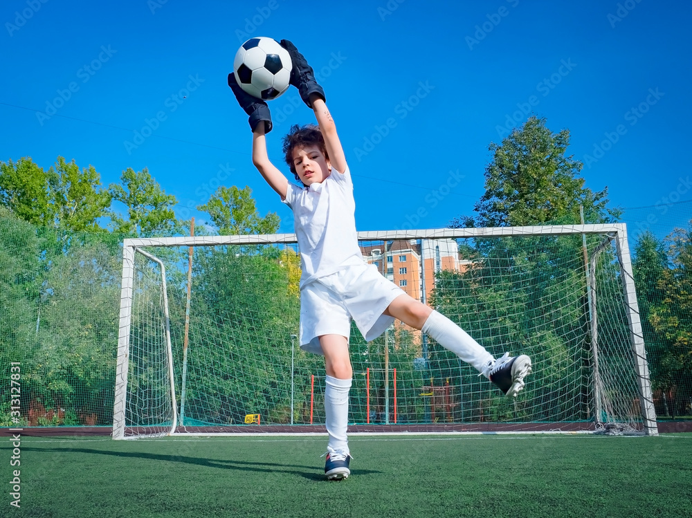 Young soccer goalie attempting to make a save. little soccer Very well made.