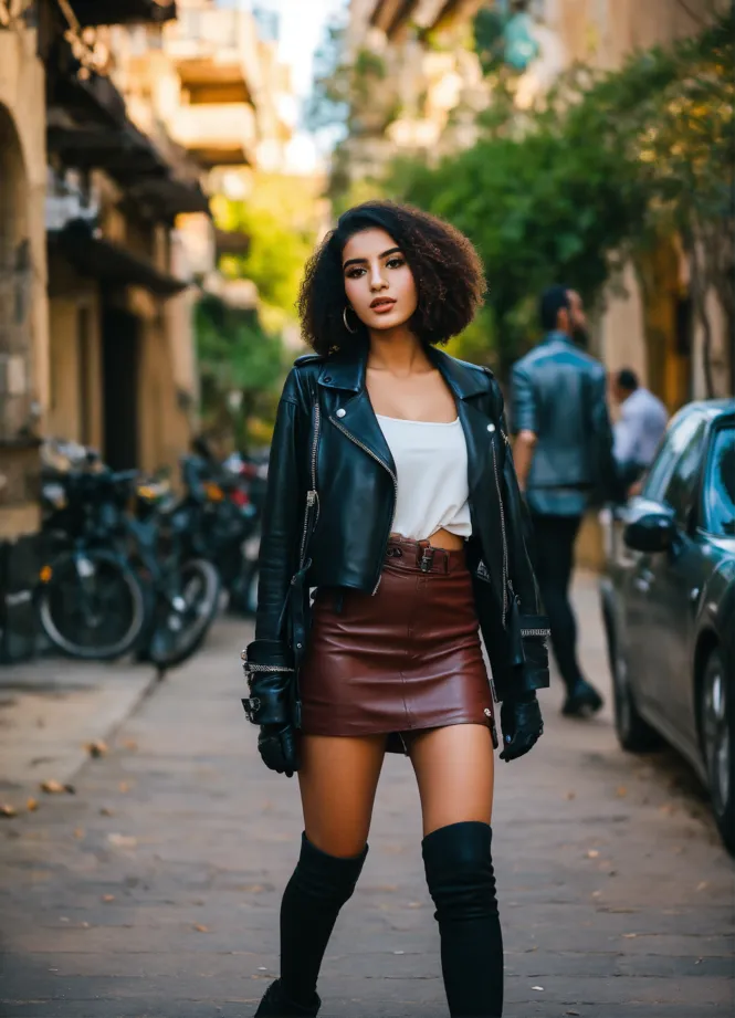 Lexica showcasing a daring ensemble. a black mini skirt and Very well made.