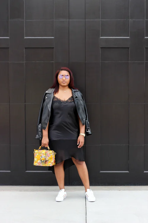 Satin Slip Dress x Moto Jacket X Adidas Jasmine Diane Very well made.