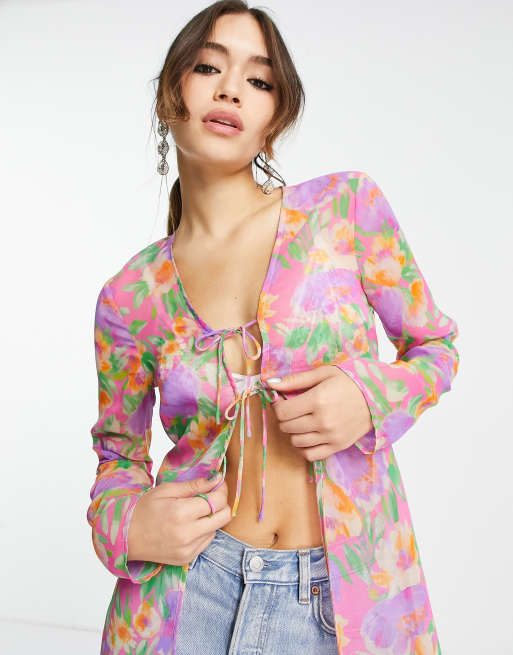 ASOS DESIGN long sleeve sheer tie front maxi kimono in pink bright print Very well made.
