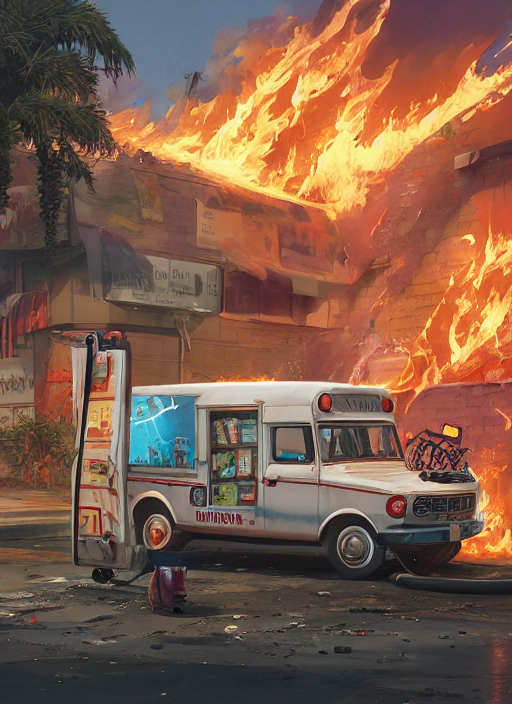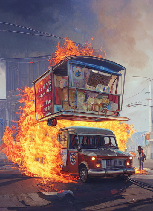 prompthunt highly detailed image of an ice cream truck on fire Very well made.