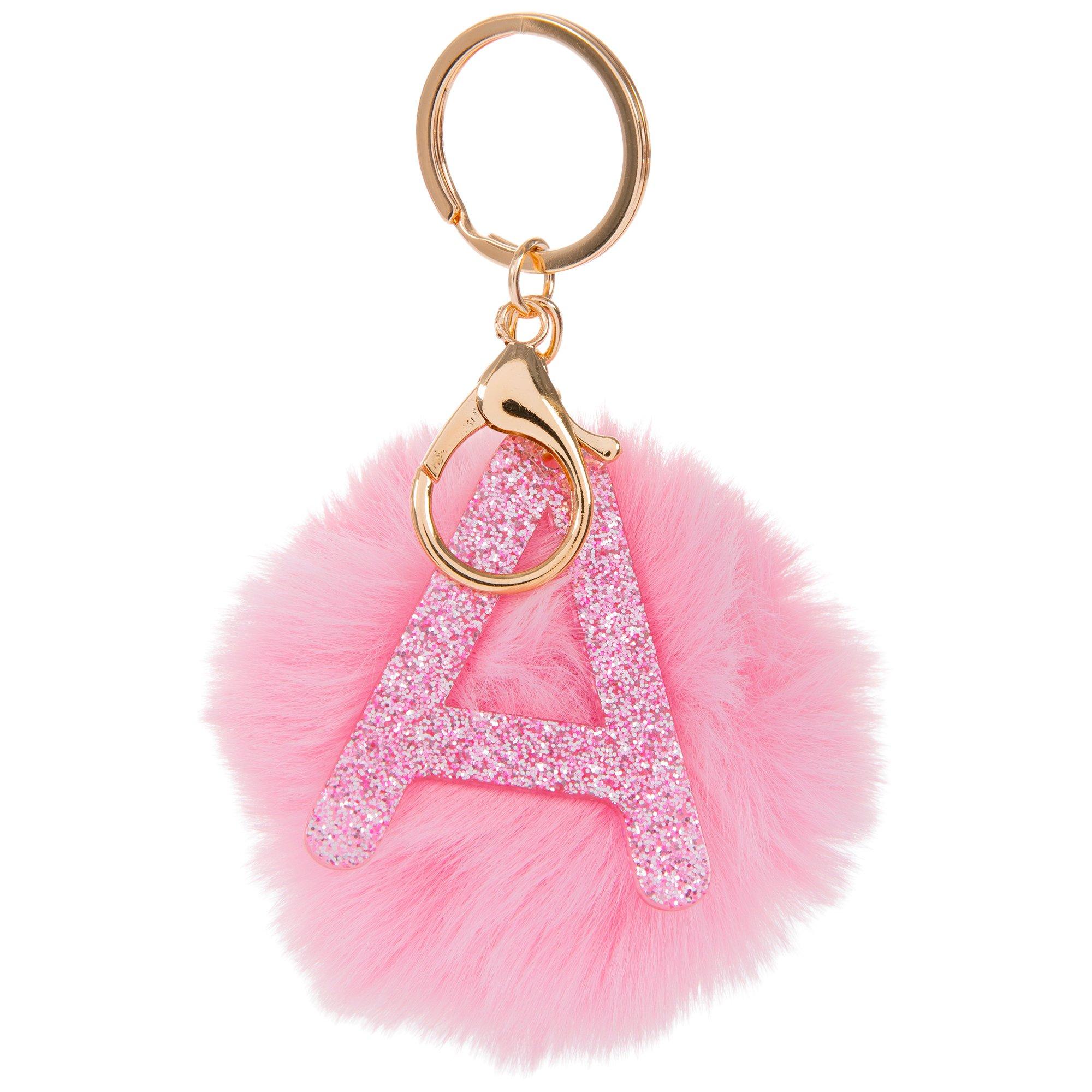 Pom Pom Keychain Artificial Fur Pink Ball Rhinestone Alphabet Letter Key Rings for Car Handbag Charm Very well made.