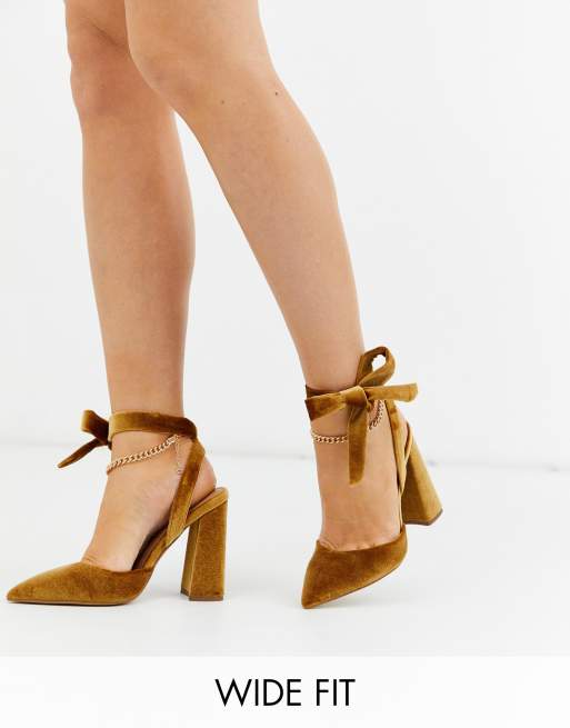 ASOS DESIGN Wide Fit Wholesome pointed block heels with chain anklet in ochre velvet Very well made.