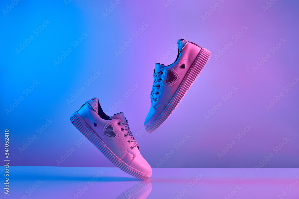 Trendy white teenage sneakers flying in trendy neon light Very well made.