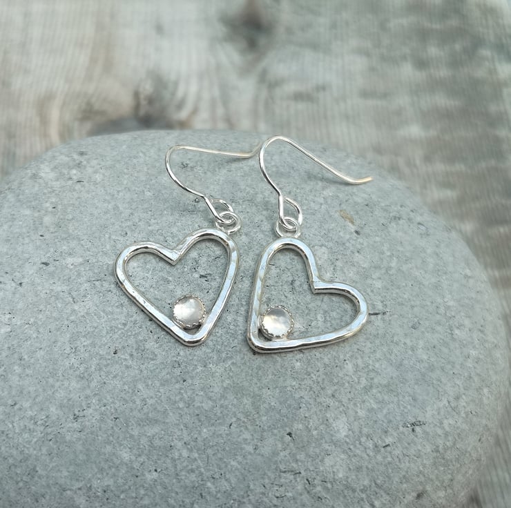 Sterling Silver Hammered Open Heart Earrings with Moonstone Gemstones Very well made.