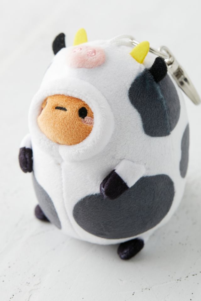 A miniature cow keychain complete with udders. Cute stuffed Very well made.