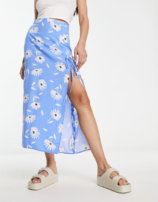 ASOS DESIGN bow detail midi skirt with thigh split in blue daisy print Very well made.