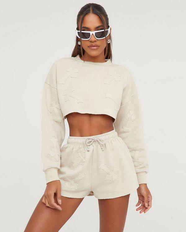 Long Sleeve Cross Patch Detail Cropped Sweater In Beige EGO Very well made.