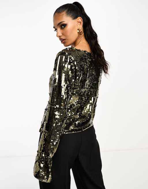 ASOS DESIGN long sleeve sequin top with tie detail in olive Very well made.
