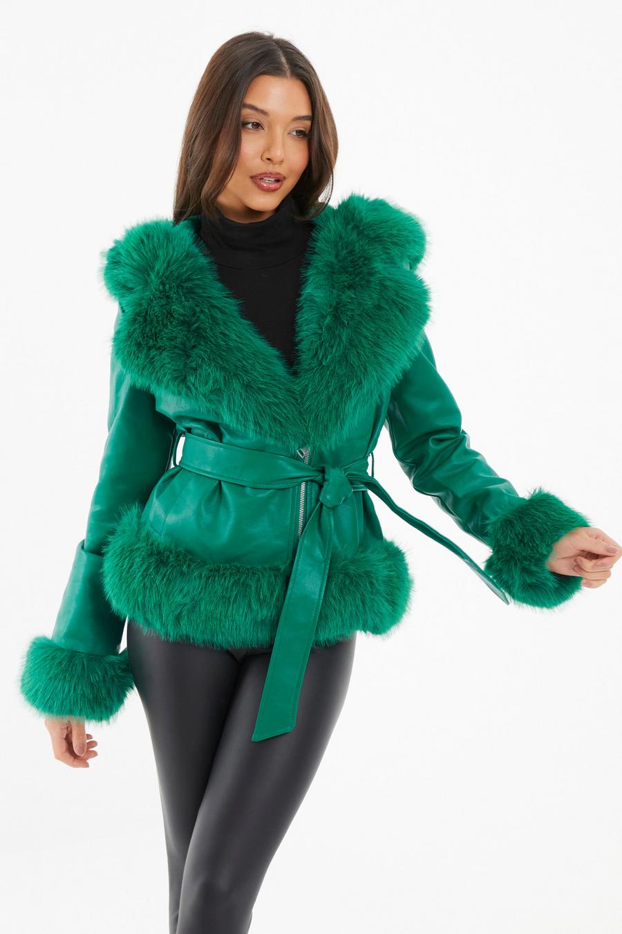 Green Faux Fur Trim Belted Jacket Quiz Clothing Very well made.