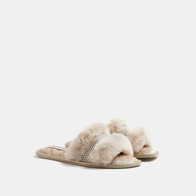 River Island Womens Gold diamante faux fur mule slippers Compare Very well made.