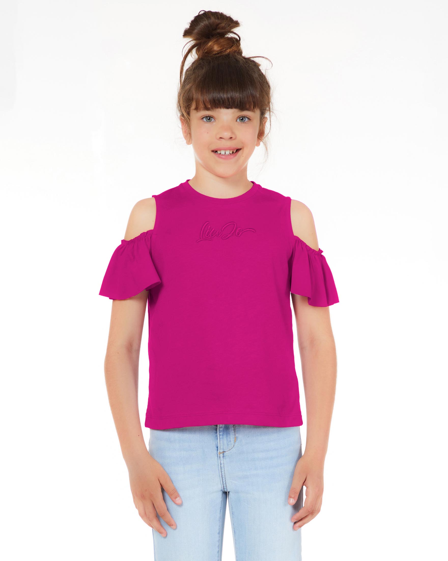 T shirt ciclamino in cotone a spalla scoperta con volant 10 16 anni Very well made.