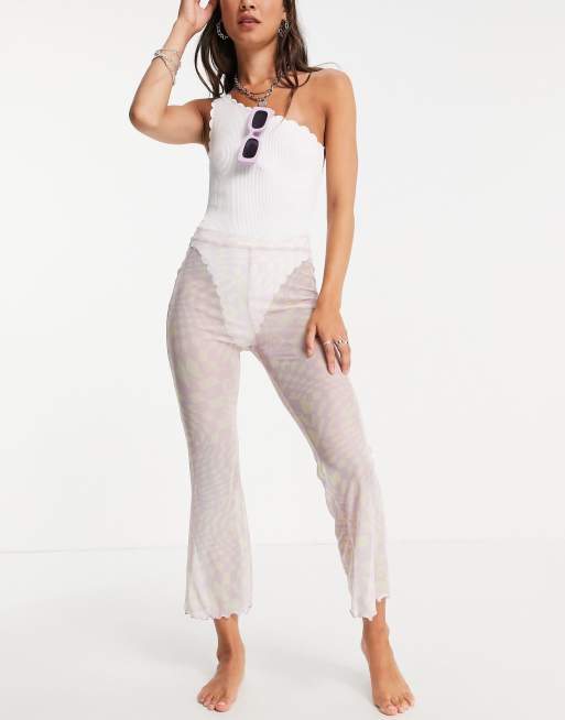 Topshop checkerboard print mesh kick flare beach trouser in multi Very well made.