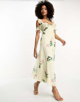 ASOS DESIGN multi flutter sleeve ruffle midaxi dress with button Very well made.