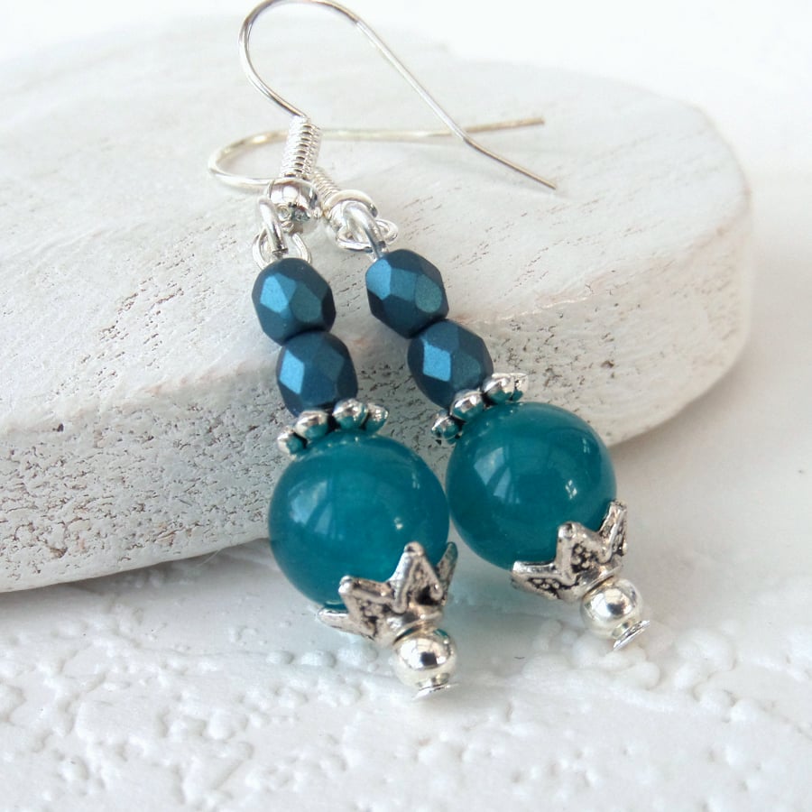 Deep turquoise blue sparkle round dichroic glass earrings Very well made.