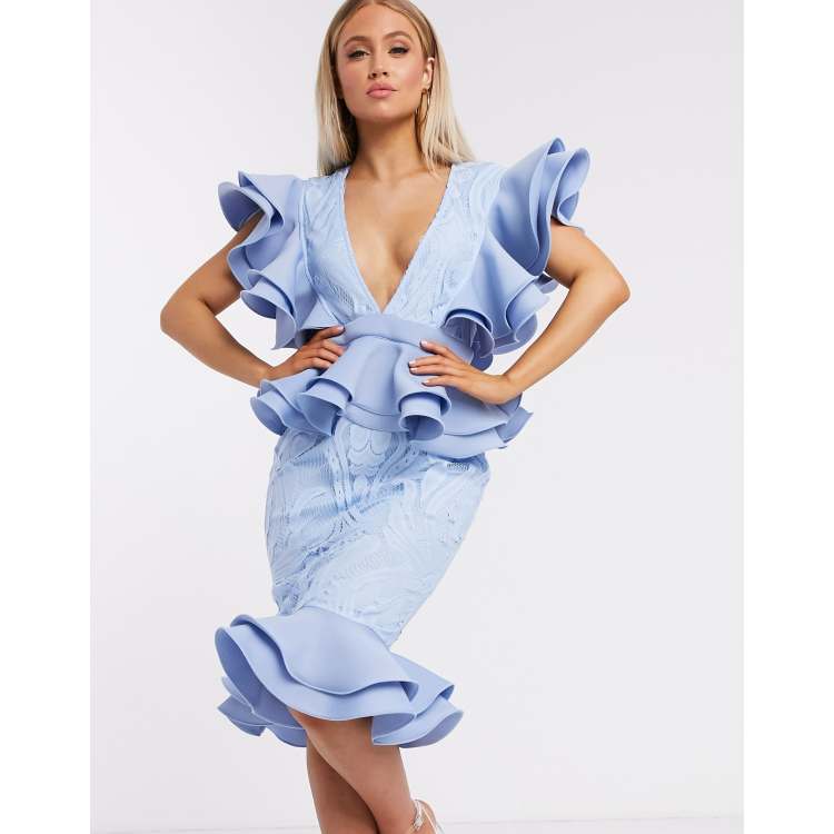 PrettyLittleThing plunge midi dress with ruffle detail in light Very well made.