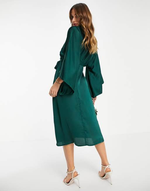 TFNC Bridesmaid kimono sleeve satin wrap midi dress in emerald green Very well made.