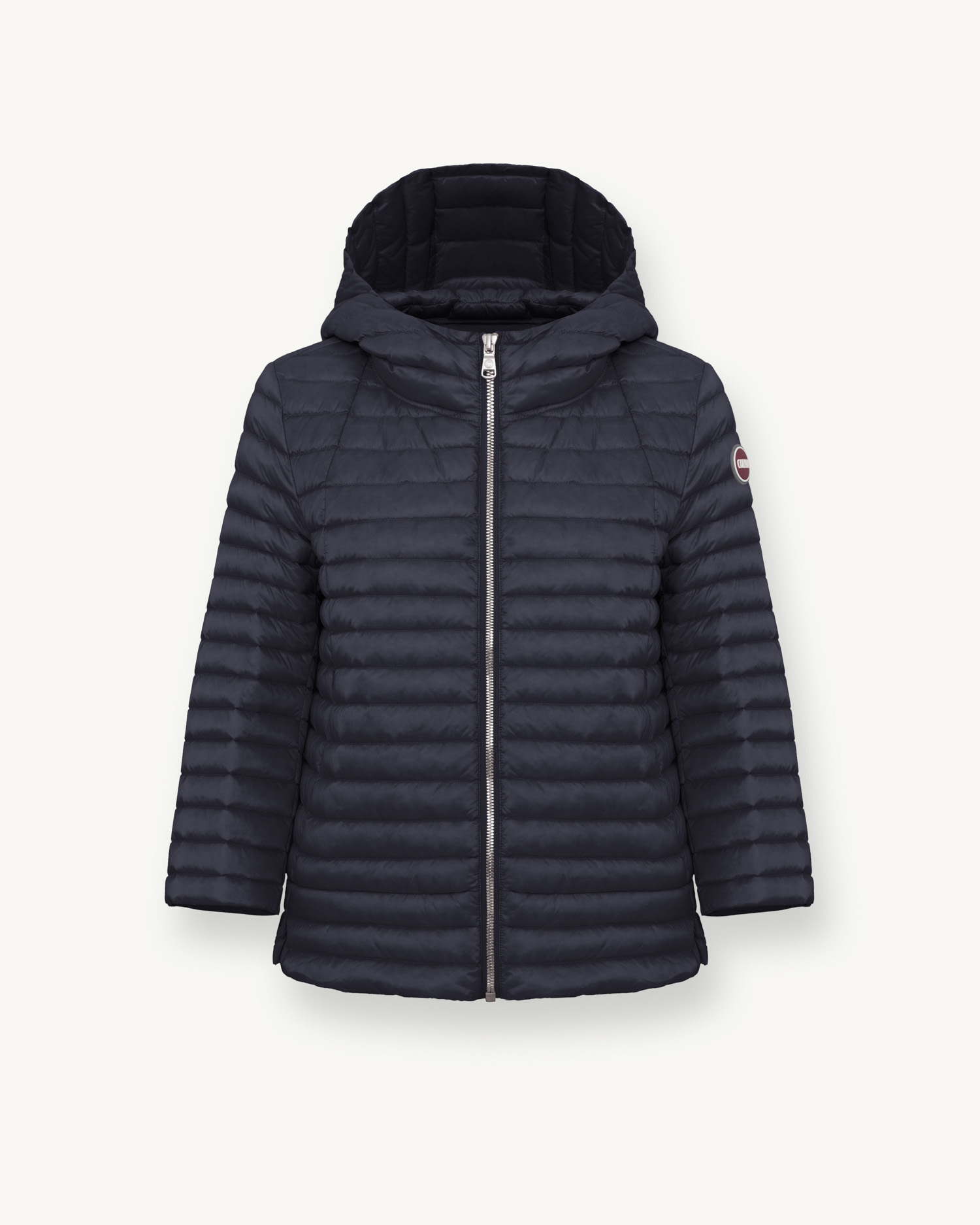 Piumino sfiancato blu con imbottitura leggera in piuma naturale e Very well made.