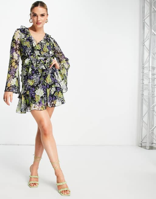 ASOS DESIGN ruffle floral print mini dress with waist tie and flare sleeve Very well made.