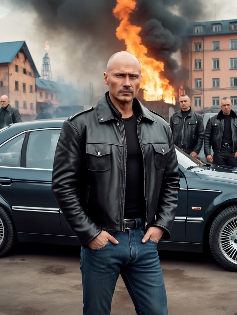 Premium AI Image A cool bald man in a leather jacket on a night out Very well made.