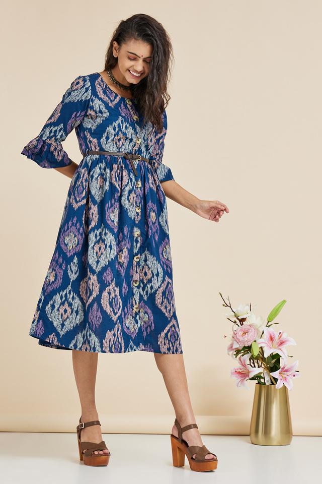 Buy online Blue Block Print A line Midi Dress from ethnic wear for Very well made.