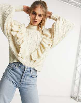 Vila high neck chunky knit jumper with frill detail and balloon sleeve in cream Very well made.